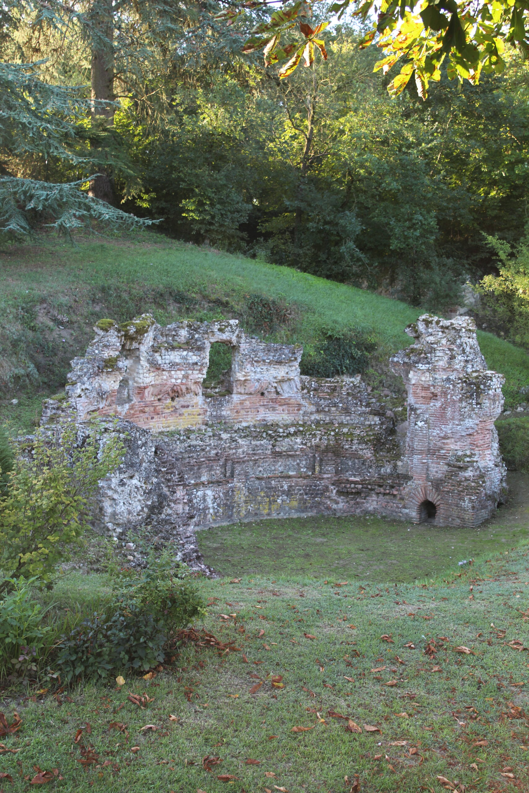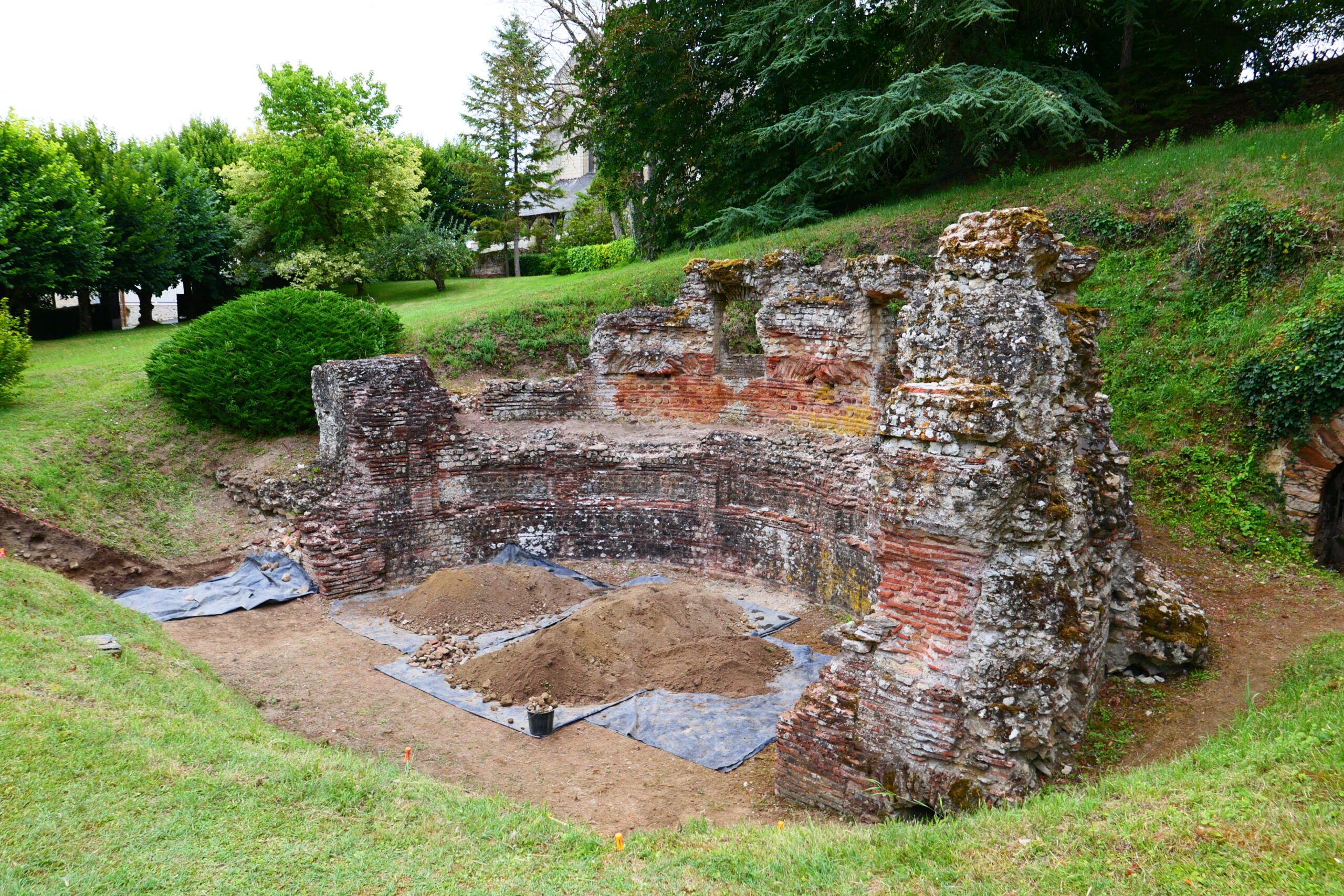 Classé au titre des monuments historiques en 1983, le nymphée, tel qu’il est visible aujourd’hui, est une grande abside de 7 mètres de diamètre environ, de 4 mètres de haut, construit dans un petit appareil de tuffeau, de grès et de terres cuites. Cette structure impressionnante par sa taille et son état de conservation n’est pourtant que la partie émergée d’un complexe beaucoup plus vaste, encore enfoui sous nos pieds!